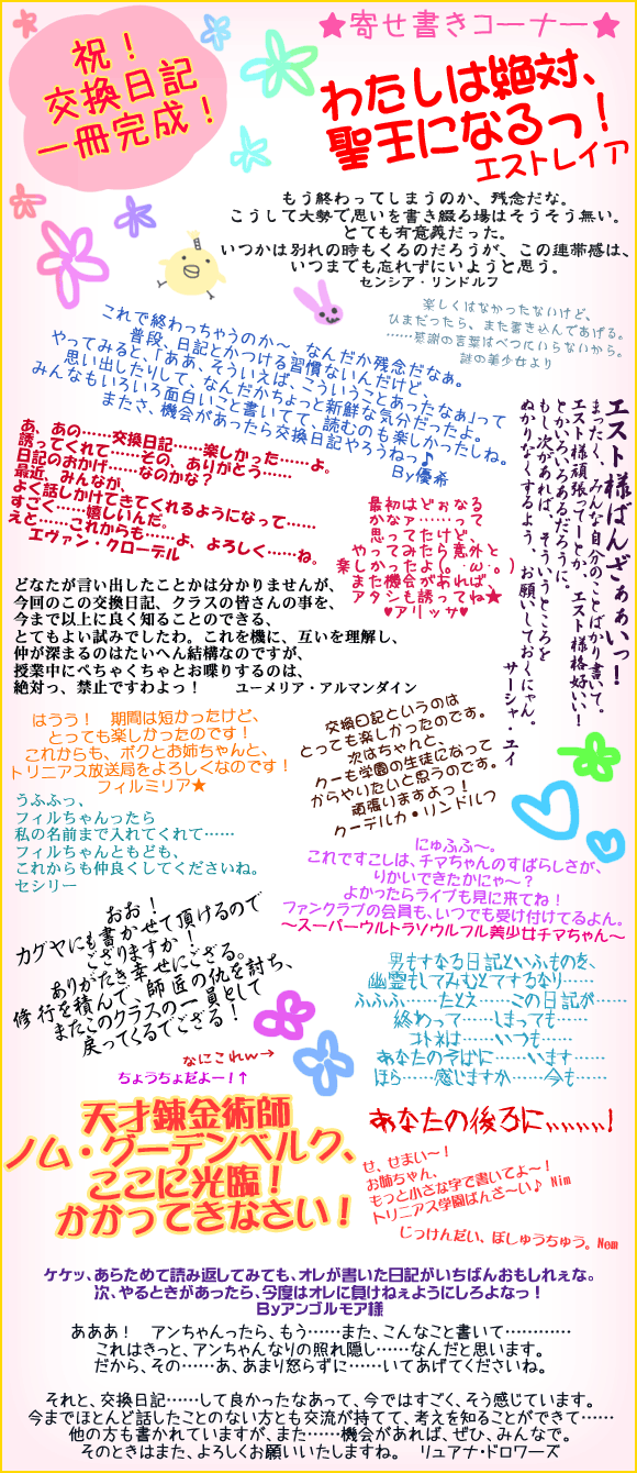では、せっかくですし、最後はクラスの皆さんで書きましょうか。 フィナーレは、華麗にっ! 優雅にっ! いきますわよっ! |